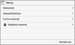 Ezarpenak automatikoki garbitzeaModu lehenetsian, denbora-epe zehatz baten ondoren ez bada inolako eragiketarik burutu, pantailan konfiguratzen ari diren ezarpenak garbituko dira eta [Etxea] pantaila bistaratuko da. Ezarpenak garbitu arte pasa behar den epea eta gero bistaratuko den pantaila alda ditzakezu.