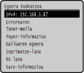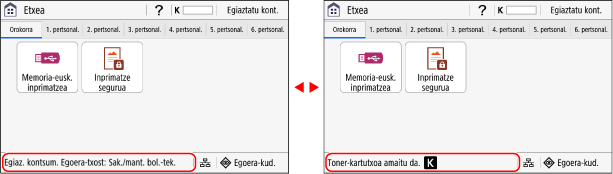 kontrol-panelean sakatzean bistaratzen da. Erabili pantaila hau makinaren informazioa, erabilera eta egunkariak, sare-ezarpenak eta erroreen informazioa begiratzeko. [Egoera-kud.] pantaila|