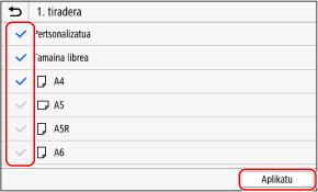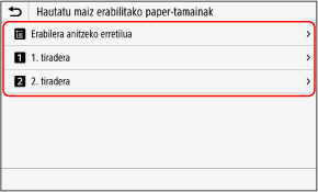 Paperaren ezarpenen pantailak maiz erabili diren erregistratutako paper-tamainak bistaratzen ditu. Erabili ez diren paper-tamainak bistaratzen badira, horiek paper-iturri bakoitzetik ezkuta ditzakezu paper-tamaina hautatzea errazagoa izan dadin.