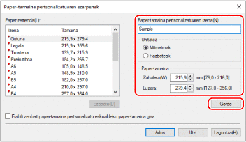Sartu tamaina pertsonalizatuko paperaren izena eta paperaren tamaina, eta sakatu [Gorde].