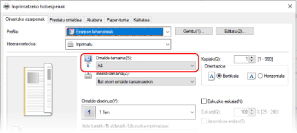 Inprimatzeko aukeren [Paper Size] aukeran, hautatu dokumentuaren paper-tamaina.