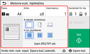 Memoria-euskarritik inprimatzea eginbideari esker, PDF, JPEG eta TIFF fitxategiak inprima ditzakezu zuzenean makinan txertatutako USB memoria batetik ordenagailurik edo inprimagailu-kontrolatzailerik erabili gabe. Bestalde, JPEG eta TIFF irudi-fitxategiak ere aurreikus ditzakezu kontrol-panelean inprimatu baino lehen.