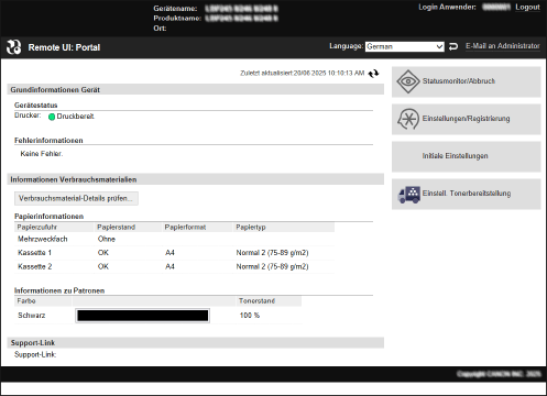 Wenn Sie sich bei Remote UI anmelden, wird die Portalseite (Hauptseite von Remote UI) angezeigt. Von hier aus können Sie den Betriebsstatus des Geräts überprüfen, verschiedene Informationen anzeigen und die Einstellungen per Schaltflächenbetätigung ändern.