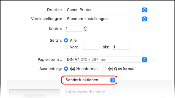 Wählen Sie im Popup-Menü der Druckoptionen die Option [Sonderfunktionen].