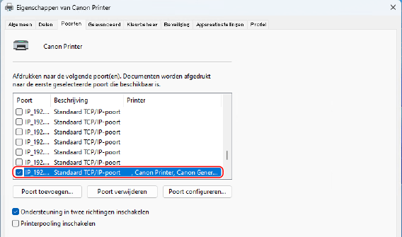 Op het tabblad [Poorten] activeert u het selectievakje [Ondersteuning in twee richtingen inschakelen].