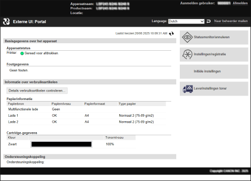 Als u inlogt bij Externe UI, verschijnt de Portal-pagina (bovenste pagina, Externe UI). Hier kunt u de bedieningsstatus van het apparaat controleren, verschillende soorten informatie bekijken, en instellingen wijzigen met knopbedieningen.