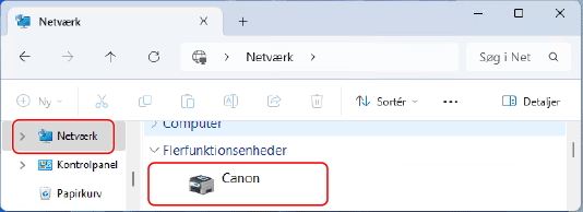 I [Netværk] skal du vælge printerserveren for at få vist den delte printer.