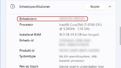 I [Enhedsspecifikationer] kan du se computernavnet.