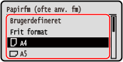 Du kan rulle ned på skærmen for at få vist papirstørrelser, der ikke vises på skærmen.
