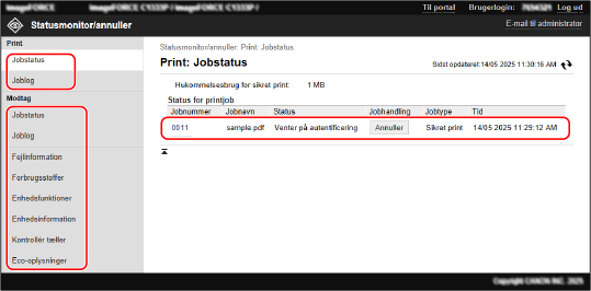 Fra Statusmonitor/annuller i Fjern-UI kan du kontrollere status og logfiler for en funktion, betjeningsstatus for maskinen og fejloplysninger.