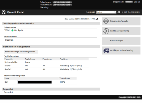 Når du logger på Fjern-UI, vises portalsiden (Fjern-UI's forside). Herfra kan du kontrollere maskinens betjeningsstatus, se forskellige oplysninger og skifte indstillingerne ved hjælp af knapper.
