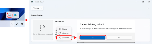 Hvis ovenstående skærmbillede ikke vises, skal du dobbeltklikke på printerikonet i Windows-meddelelsesområdet, vælge det dokument, du vil annullere, og højreklikke på