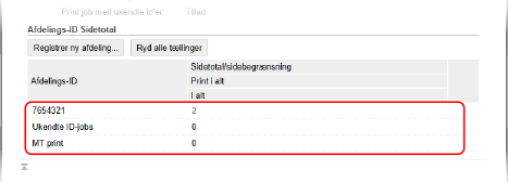 Du kan se antallet af sider, der er udskrevet for hvert afdelings-id, når administrering af afdelings-id er aktiveret.