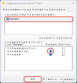 2 | В [Разрешения] установите флажок [Разрешить] в [Изменение]. |