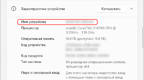 Посмотрите имя компьютера, приведенное в [Характеристики устройства].