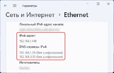 2 | Посмотрите IP-адрес и сервер DNS, приведенные в [Свойства]. |