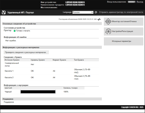 После входа в удаленный интерфейс пользователя открывается страница его портала. На ней можно проверить состояние операций аппарата, просмотреть различную информацию и изменить настройки с помощью соответствующих кнопок.