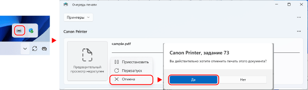 Если приведенный выше экран не отображается, дважды щелкните значок принтера в области уведомлений Windows, выберите документ, печать которого следует отменить, затем щелкните правой кнопкой мыши