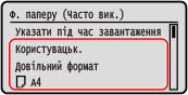 Якщо потрібно часто змінювати папір для завантаження, установіть параметр [Довільний]. Це зменшить кількість кроків, які необхідно щоразу виконувати для зміни параметрів. Проте слід пам’ятати, що в такому разі апарат друкуватиме, навіть якщо завантажений папір відрізняється від типу паперу, указаного в драйвері принтера.