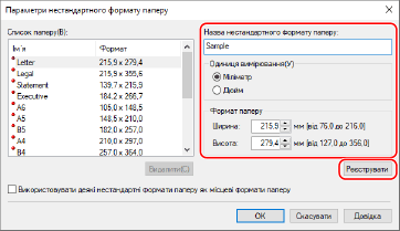Введіть ім’я та розмір власного формату паперу й натисніть [Реєструвати].