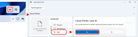 Goiko pantaila bistaratzen ez bada, sakatu bitan inprimagailuaren ikonoan Windows-en jakinarazpen-eremuan, hautatu ezeztatu nahi duzun dokumentua eta sakatu eskuineko botoiarekin
