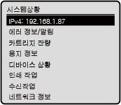 이 화면은 [홈] 화면과 다른 위치에서 [시스템 상황]을 누르거나 제어판에서 을 누르면 표시됩니다. 이 화면을 사용하여 기기 정보, 사용량 및 로그, 네트워크 설정, 오류 정보를 확인합니다. [시스템 상황] 화면