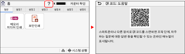 [홈] 화면의 [도움말]    [설명서 QR 코드를 표시] 를 누르면 QR 코드가 표시됩니다.