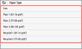 If you frequently need to change the paper to be loaded, set to [Free]; this will reduce the number of steps required to change the setting each time. However, note that this setting lets the machine perform printing even if there is mismatch between the paper type setting in the printer driver and the paper type actually loaded in the machine.