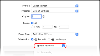 2 | From the print options pop-up menu, select [Special Features]. If print options are not displayed, click [Show Details] in the printing dialog box. |