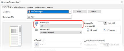 ใน [ขนาดกระดาษ] บนแท็บ [การตั้งค่าพื้นฐาน] ให้เลือกขนาดกระดาษของเอกสาร