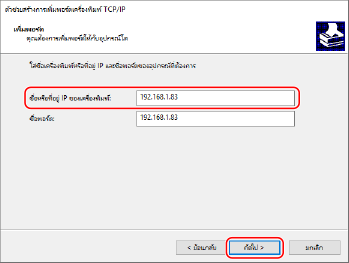 หน้าจอ [ตัวช่วยสร้างการเพิ่มพอร์ตเครื่องพิมพ์ TCP/IP] จะปรากฏขึ้นมา