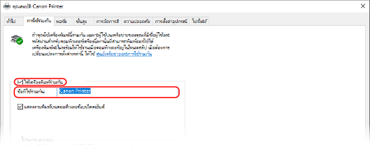 บนแท็บ [การใช้ร่วมกัน] ให้เลือกกล่องกาเครื่องหมาย [ใช้เครื่องพิมพ์ร่วมกัน] แล้วใส่ชื่อที่ใช้ร่วมกัน