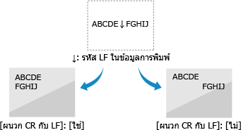 เลือกว่าจะเชื่อมต่ออักขระขึ้นบรรทัดใหม่ (CR) หรือไม่เมื่อเครื่องได้รับรหัสป้อนบรรทัด (LF) หากเลือก [ใช่] ไว้ ตำแหน่งการพิมพ์จะย้ายไปที่จุดเริ่มต้นของบรรทัดถัดไปเมื่อเครื่องได้รับรหัส LF หากเลือก [ไม่] ไว้ ตำแหน่งการพิมพ์จะย้ายไปที่บรรทัดถัดไป ใต้รหัส LF ที่ได้รับ |