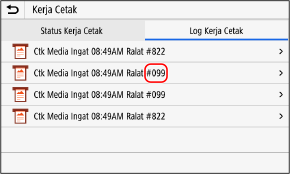 Jika pencetakan tidak dapat dilakukan, I-Fax tidak dapat diterima, atau ralat lain berlaku, kod ralat (nombor tiga digit bermula dengan "#") dipaparkan dalam log kerja.