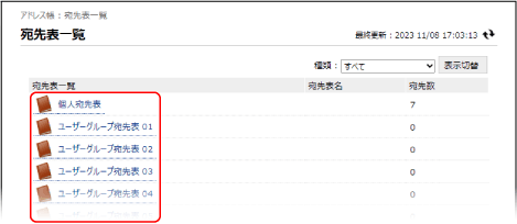 アクセス番号が設定されている宛先を表示する場合は、画面右上の[アクセス番号]に番号を入力し、[表示切替]をクリックします。