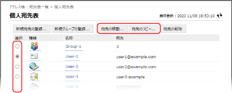 移動/コピーする宛先を選択し、[宛先の移動]または[宛先のコピー]をクリックする