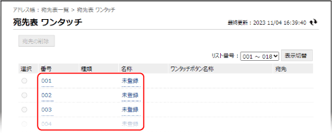 ワンタッチボタンには 3 桁の番号(001~200)が割り振られています。画面右上の[リスト番号]で、番号の範囲を選択し、[表示切替]をクリックすると、一覧に表示される番号が切り替わります。