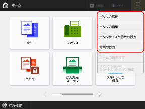 [ホーム]画面の、機能や設定のボタンの並び順を変更したり、あらかじめ用意されている複数の画像の中から好みの画像に背景を変更したりできます。