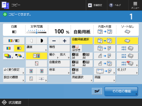 クイック画面に切り替えると、拡大/縮小や両面コピーなどの基本的な機能の設定値がボタンで表示されます。それらの機能は、表示されている設定値のボタンを押すだけで設定ができるため、シンプル画面よりも少ない手順で設定することができます。