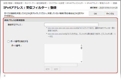 IPアドレスフィルターの設定画面で、編集したい例外アドレスをクリックすると、登録内容を編集できます。