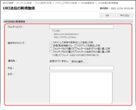 共有フォルダー/ファイルサーバー/アドバンスドボックスの宛先の設定※サブフォルダーにファイルが保存されたときは通知しません。
