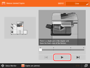 * The screen is repeatedly displayed until the paper or staple jam has been removed. When you press [Close], the screen may close temporarily, and you may be able to perform another operation or setting.