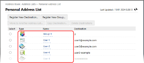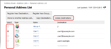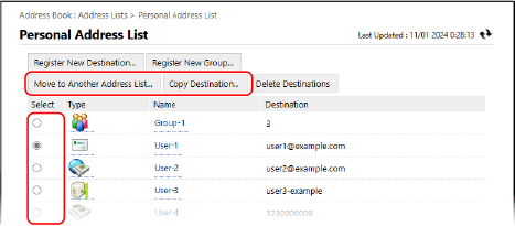 Selecione o destino que será movido ou copiado e clique em [Move to Another Address List] ou [Copy Destination].