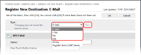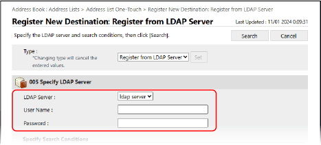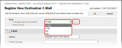 Em [Type], selecione [Register from LDAP Server] e clique em [Set].
