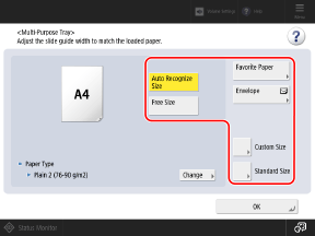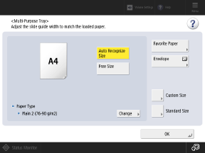 Quando o papel é colocado na bandeja multiuso, a tela a seguir é exibida no painel de controle. Defina o tamanho e o tipo do papel de acordo com o papel colocado.