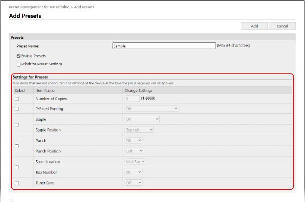 A predefinição registrada é adicionada à tela [Preset Management for IPP Printing].