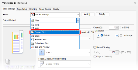 Você pode definir a função de impressão segura nas configurações de impressão do driver e enviar os dados seguros para a máquina.