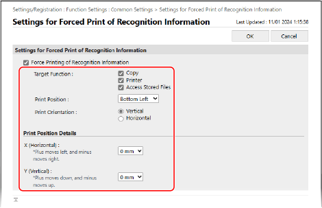 A tela [Settings for Forced Print of Recognition Information] é exibida.