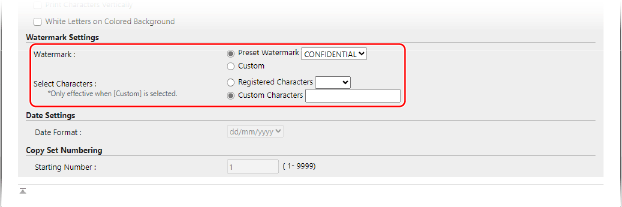 Para incorporar uma cadeia de caracteres personalizada, selecione [Custom] em [Watermark], Selecione [Custom Characters] em [Select Characters] e insira a cadeia de caracteres que deseja incorporar.