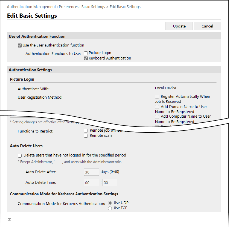 Marque esta caixa de seleção para excluir usuários registrados automaticamente no dispositivo local que não fizeram login na máquina por um período determinado. Em [Auto Delete After] e [Auto Delete Time], insira o número de dias desde a data do último login até a exclusão automática, e especifique a hora para fazer essa exclusão.